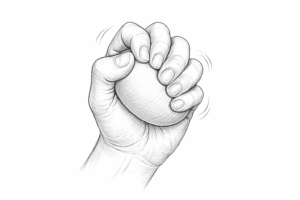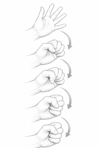 - Straight Fist: Finally, make a straight fist by bending the knuckle joints (at the base of your fingers) while keeping the last joints (the ones near your fingernails) straight. In this position, your fingertips touch the lower part of your palm or the base of your fingers. (It’s like a half-fist where the fingers are folded in, but the fingertips are not curled under.) Hold briefly, then unfold your fingers straight again.